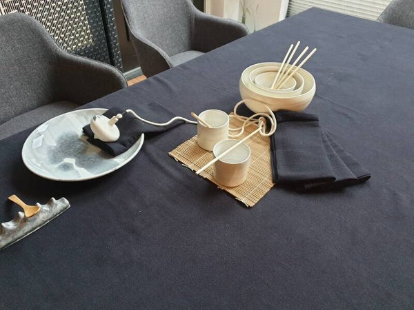 Een duurzaam en Fairtrade tafellaken van linnen met organic cotton. Dit product wordt gemaakt door een klein familiebedrijf in India. Het textiel wordt handgeverfd met natuurlijke verfstoffen.